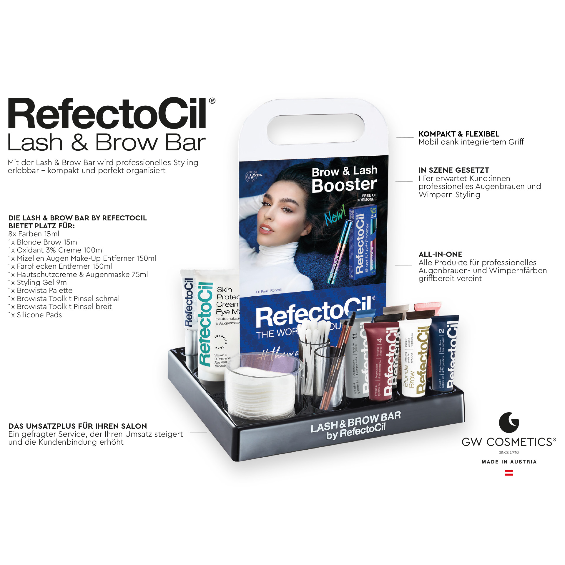 Super practical & super stylish. The new RefectoCil Lash & Brow Bar is small, lightweight and can be carried from place to place thanks to the integrated handle. With integrated containers for colors and accessories.