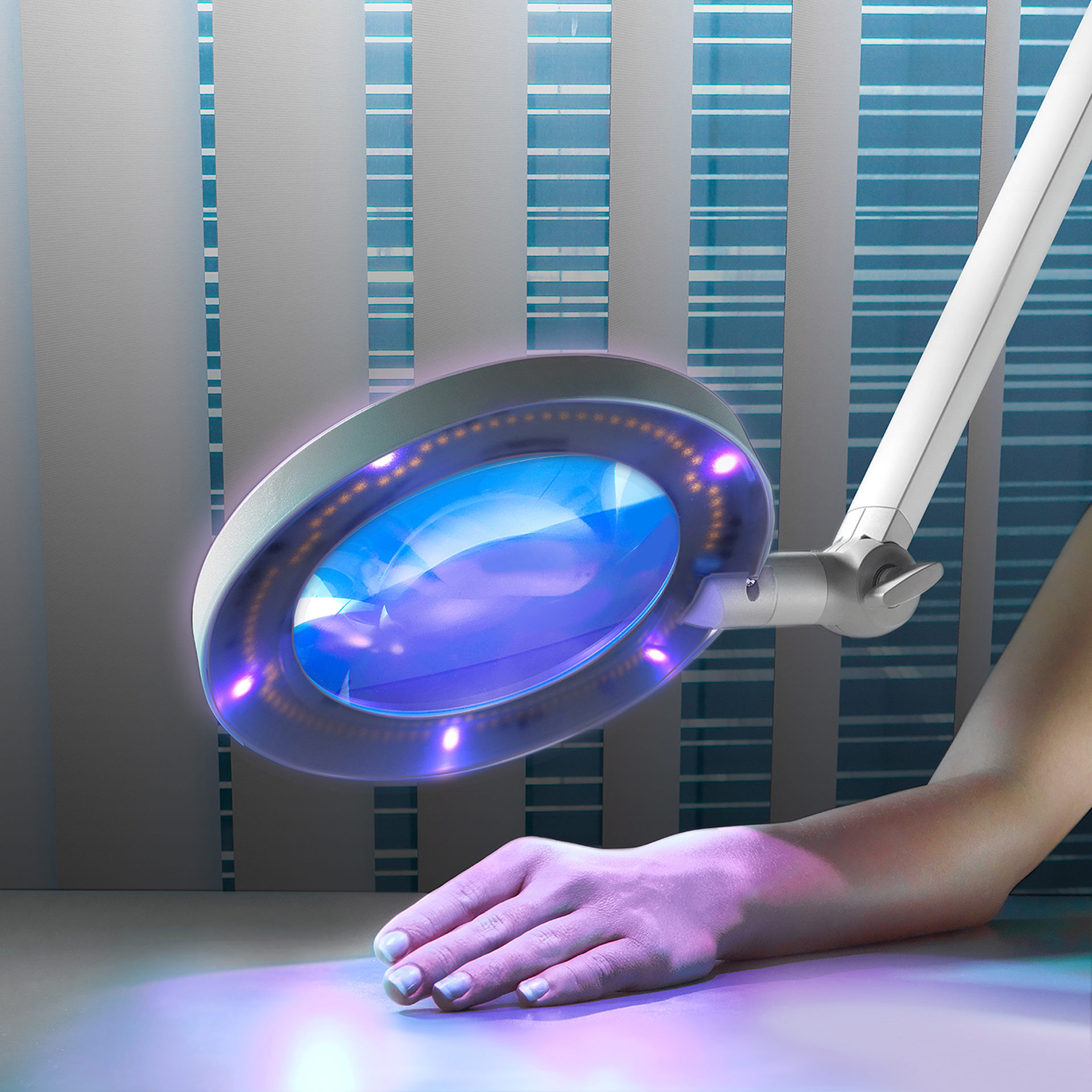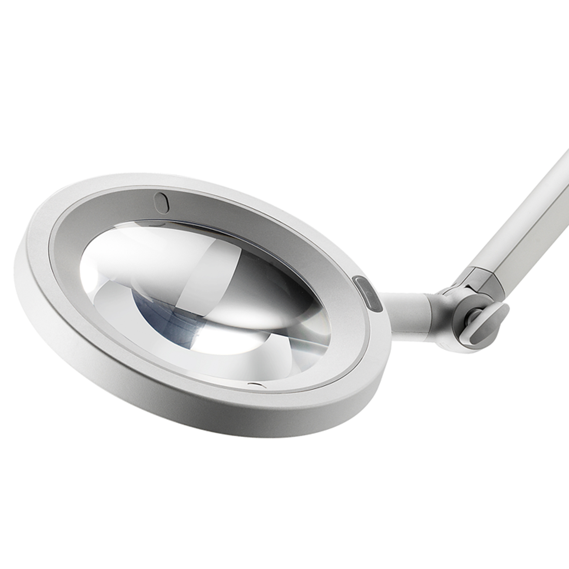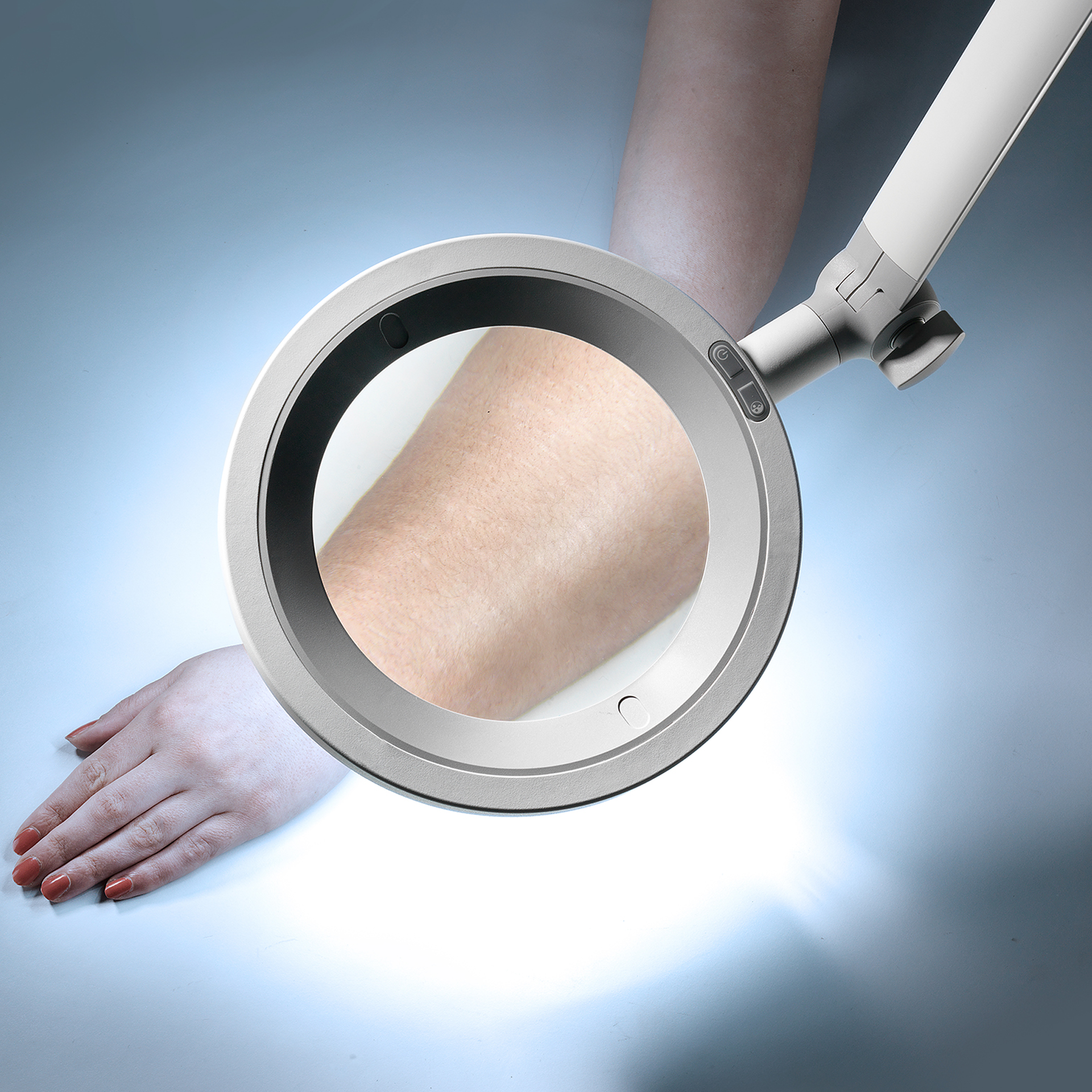 Die OPTICLUX von Derungs hat alles, was eine moderne Lupenleuchte haben muss: eine robuste Lupe mit 1.9-facher Vergrößerung, neueste LED-Module, ergonomisch erprobte Armgelenke und intuitive Bedienung. Zwei Beleuchtungsmodi in einem Gerät. Für ein ausgeleuchtetes Arbeiten ein normales LED Licht sowie zusätzliche Wood-Light, mit welchem fluoreszierende Krankheiten und Pigmentveränderungen bestmöglich erkennt werden können. Sie hat eine hochwertige und kratzfest beschichtete Acrylglaslinse mit 3,5 Dioptrien und einen Lupendurchmesser von 160 mm. 90 LEDs sorgen für ein perfektes Sehfeld und gewährleisten eine schattenarme Ausleuchtung des Untersuchungsbereichs. Das helle, starke Licht ist stufenlos dimmbar. Dadurch passt sich die OPTICLUX der individuellen Sehaufgabe an und entlastet die Augen spürbar. Das Federgestänge und die innenliegenden Reibegelenke ermöglichen eine komfortable Handhabung der Leuchte ohne Absinken des Leuchtenkopfes. Die Lupenleuchte OPTICLUX von Derungs ist als geprüftes Medizinprodukt in der Dermatologie, Kliniken und Praxen für human-, zahn-, und veterinärmedizinischen Zwecke, vielseitig einsetzbar.