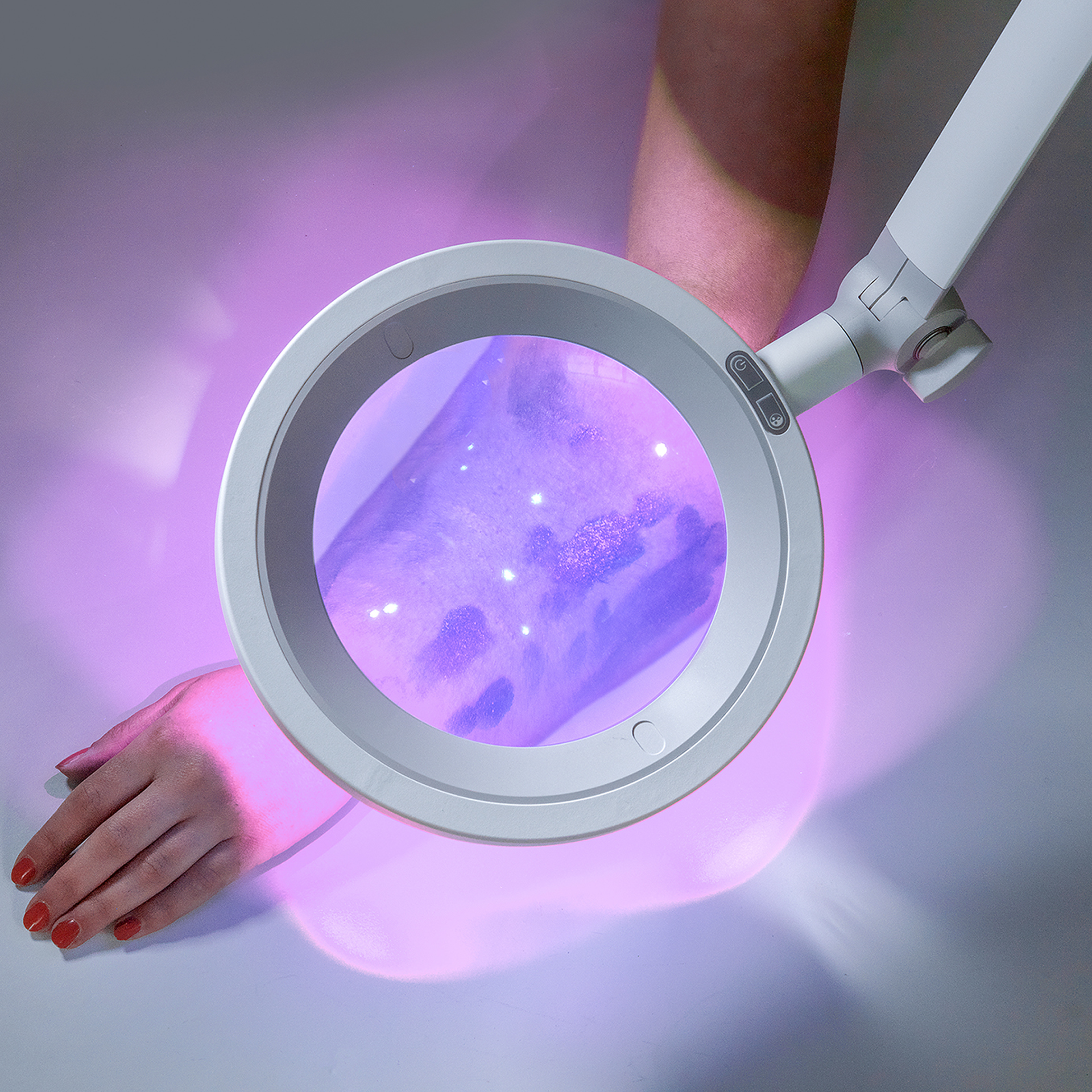 Wood-Licht kann zur Frühdiagnose von Vitiligo eingesetzt werden. Insbesondere bei Patienten:innen mit heller Haut können Läsionen frühzeitig erkannt und somit auch rascher behandelt werden. Diese Bereiche haben unter Wood-Licht schärfere Grenzen und sehen hellblau-weiss oder gelb-grün aus.