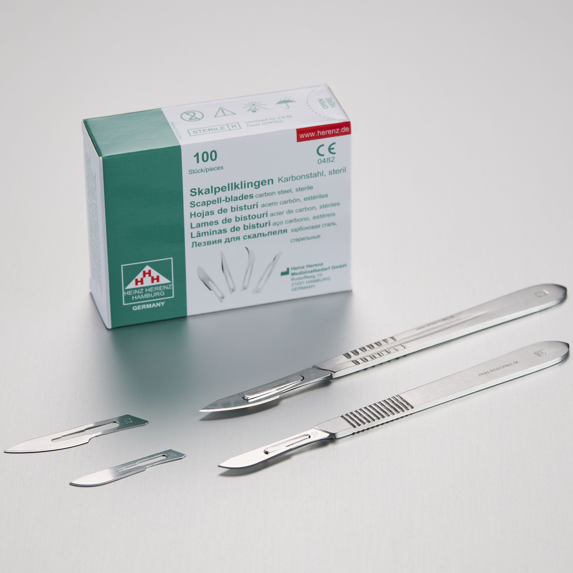 Die Heinz Herenz Skalpellklingen werden zur Einmal-Verwendung an einem separaten Skalpellgriff eingesetzt. Die sterilen und einzeln verpackten Klingen werden in 6 verschiedenen Klingenformen angeboten und sind dadurch für unterschiedliche Anwendungsgebiete einsetzbar. Sie werden aus rostfreiem, medizinischem Karbonstahl hergestellt und sind dadurch besonders robust und bruchsicher. Die gewählte Größe wird zu je 100 Stück geliefert. Für die Skalpellklingen Figuren 10-15 benötigen Sie den Halter Nr. 3. (31638) Für die Skalpellklingen Figuren 18-23 benötigen Sie den Halter Nr. 4. (31639).